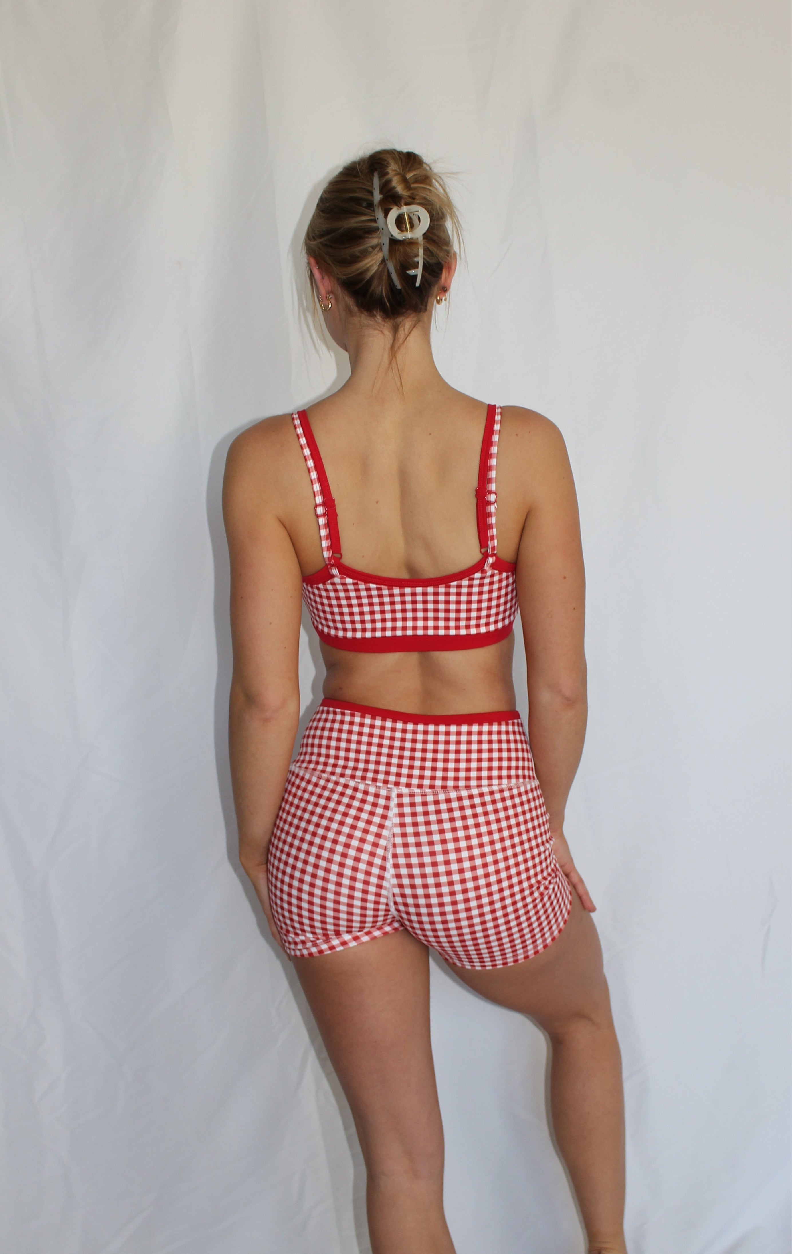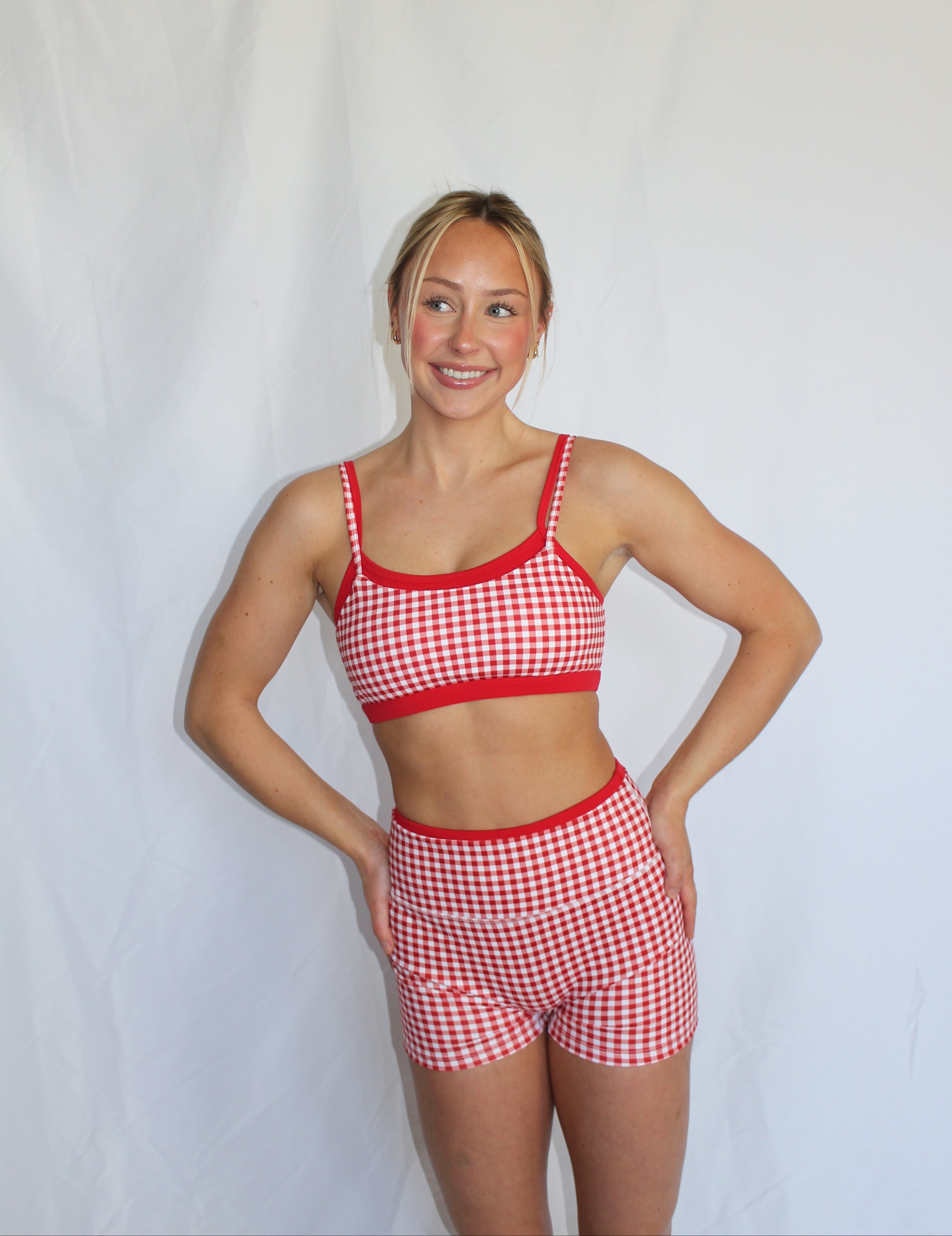 This red gingham sports bra is the perfect mix of sweet and sporty, bringing a playful yet confident vibe to your activewear collection. The classic gingham print adds a feminine touch while still keeping the look bold and eye-catching.