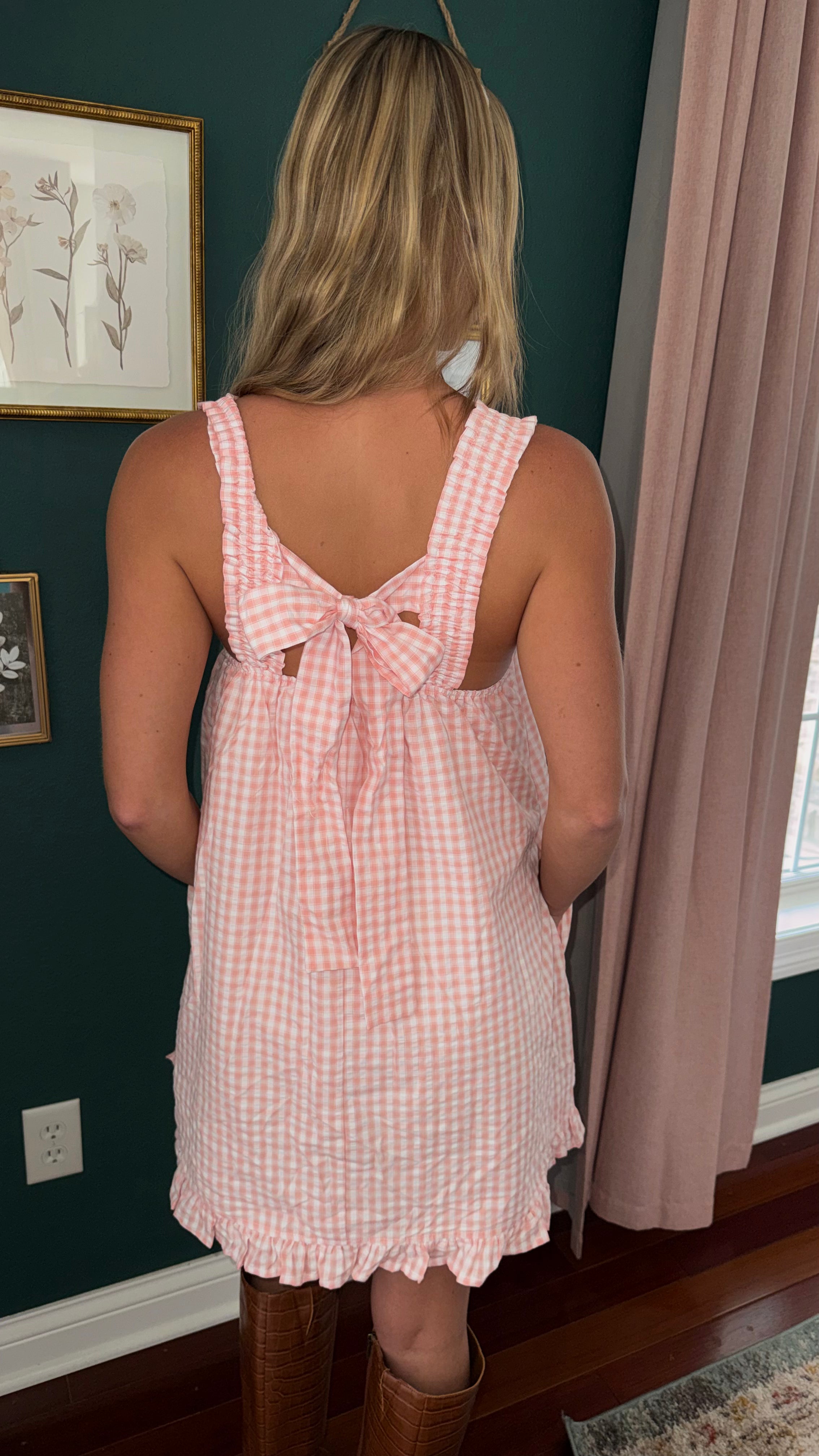This dreamy pink gingham dress is the definition of soft, feminine charm. Designed with a flowy silhouette that moves effortlessly, it features delicate ruched straps and a dainty bow tied at the back for the sweetest finishing touch. Light, airy, and oh-so pretty, this piece brings a soft, delicate feel that’s perfect for sunny days and cottagecore moments.