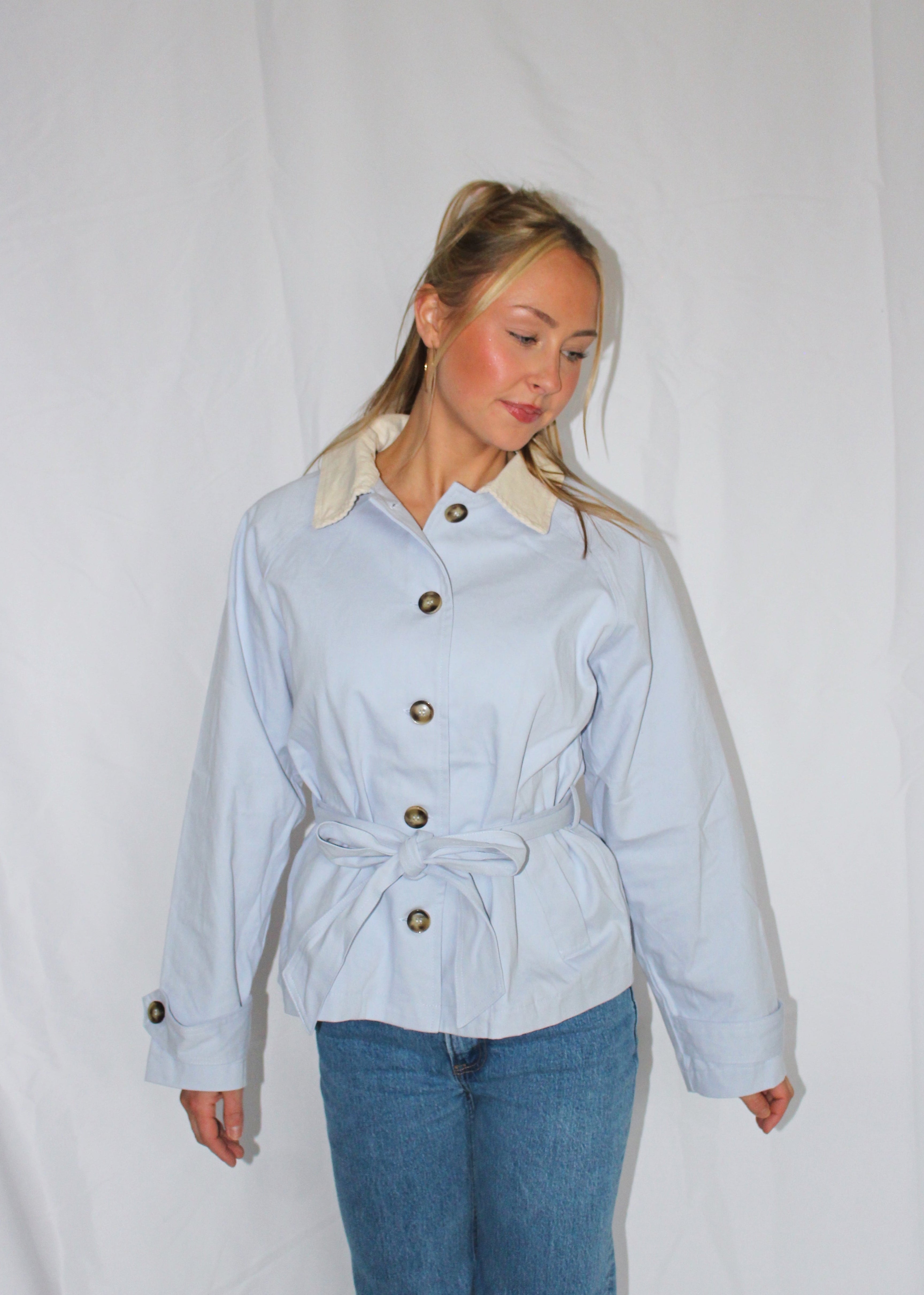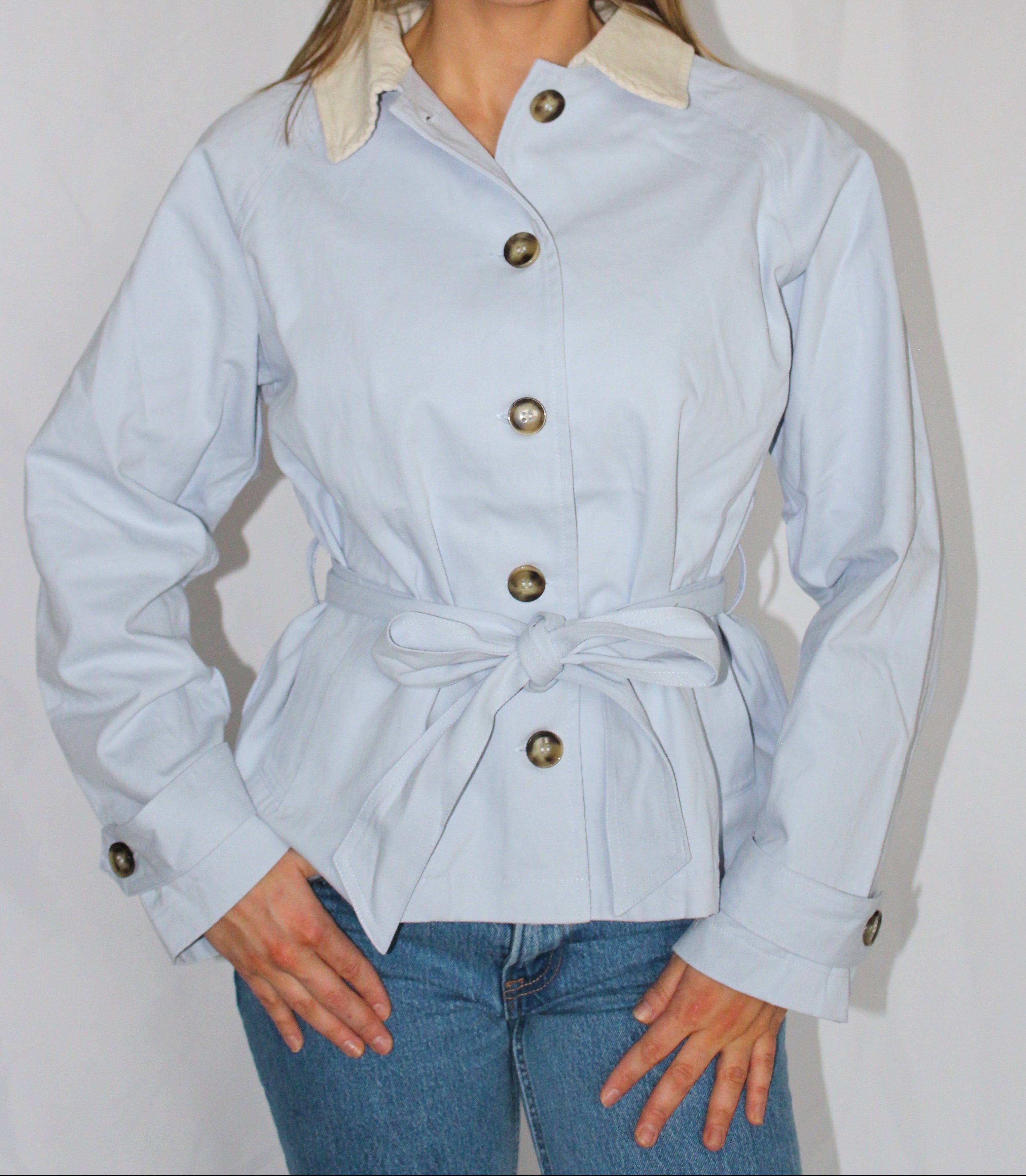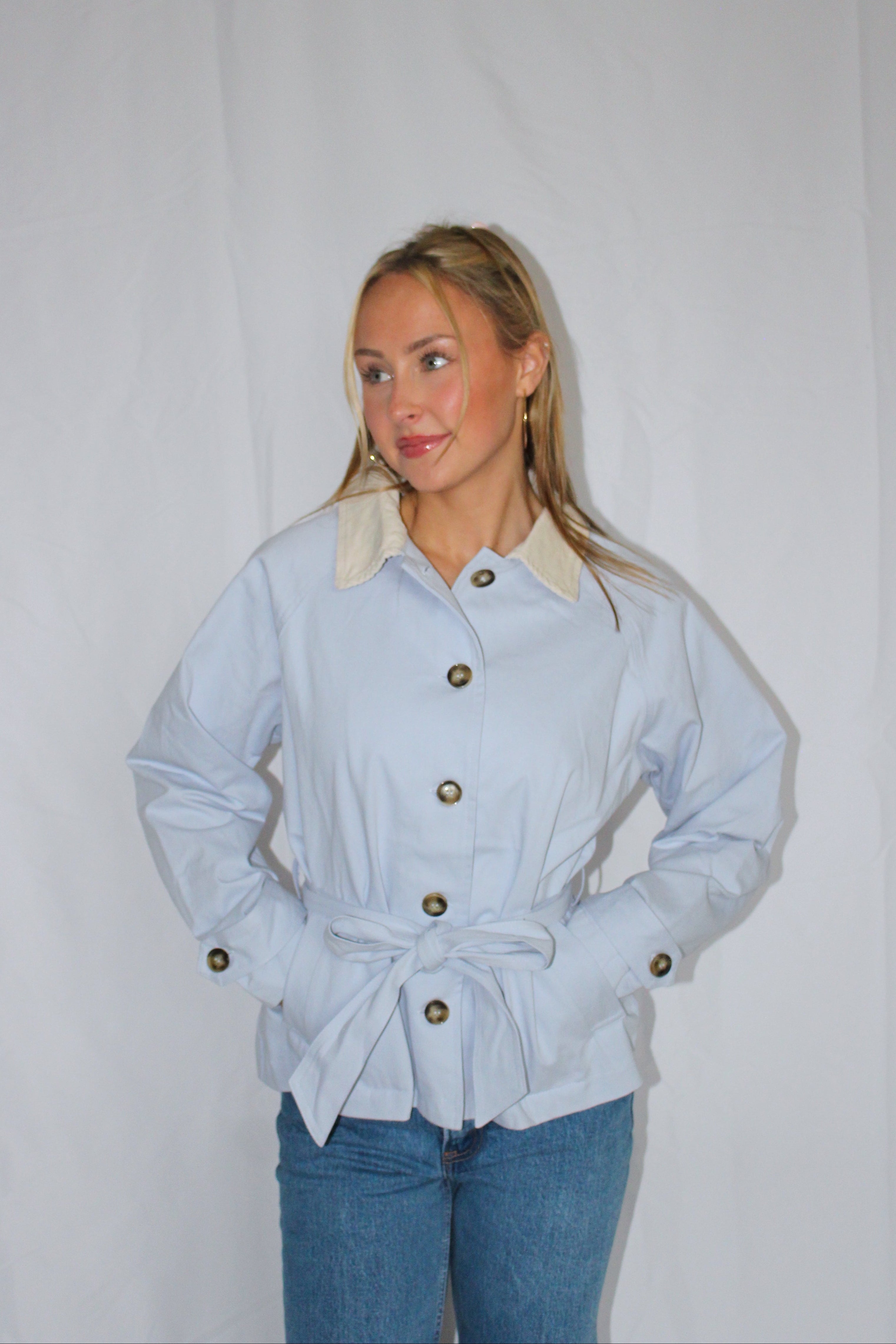 Elevate your spring wardrobe with this stunning light baby blue trench coat — the perfect soft statement piece. Crafted from 100% cotton, this coat offers exceptional quality with a breathable, comfortable feel that’s ideal for the season.