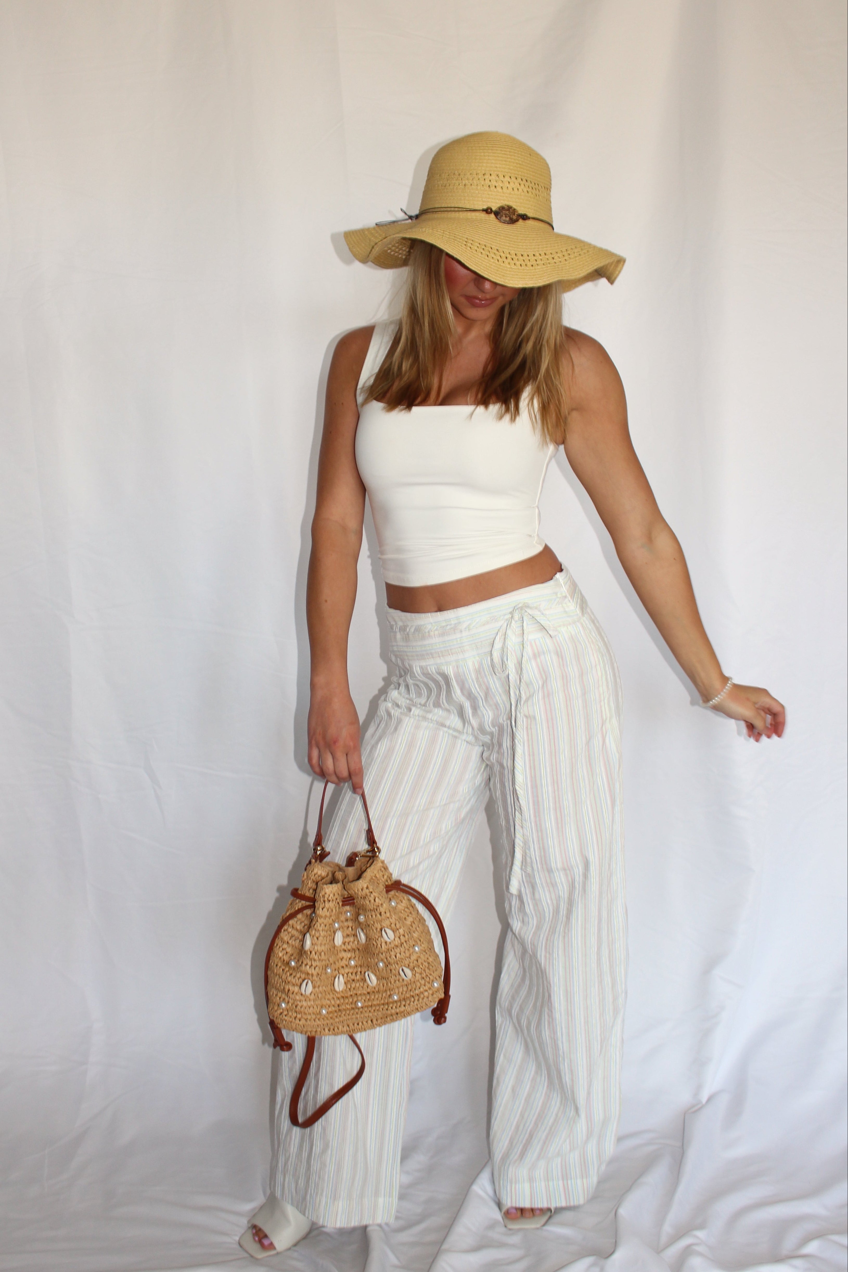 These flowy high-waisted pants are the definition of effortless spring and summer style. Made from a breathable 70% cotton and 30% linen blend, they’re lightweight, airy, and perfect for warm days. The subtle pinstripe detailing adds a timeless touch, while the adjustable side tie gives them a flattering, feminine finish. Designed with a hidden side zipper for a smooth fit, these pants move beautifully and feel as good as they look. The ultimate beach-to-brunch staple you’ll reach for all season long.