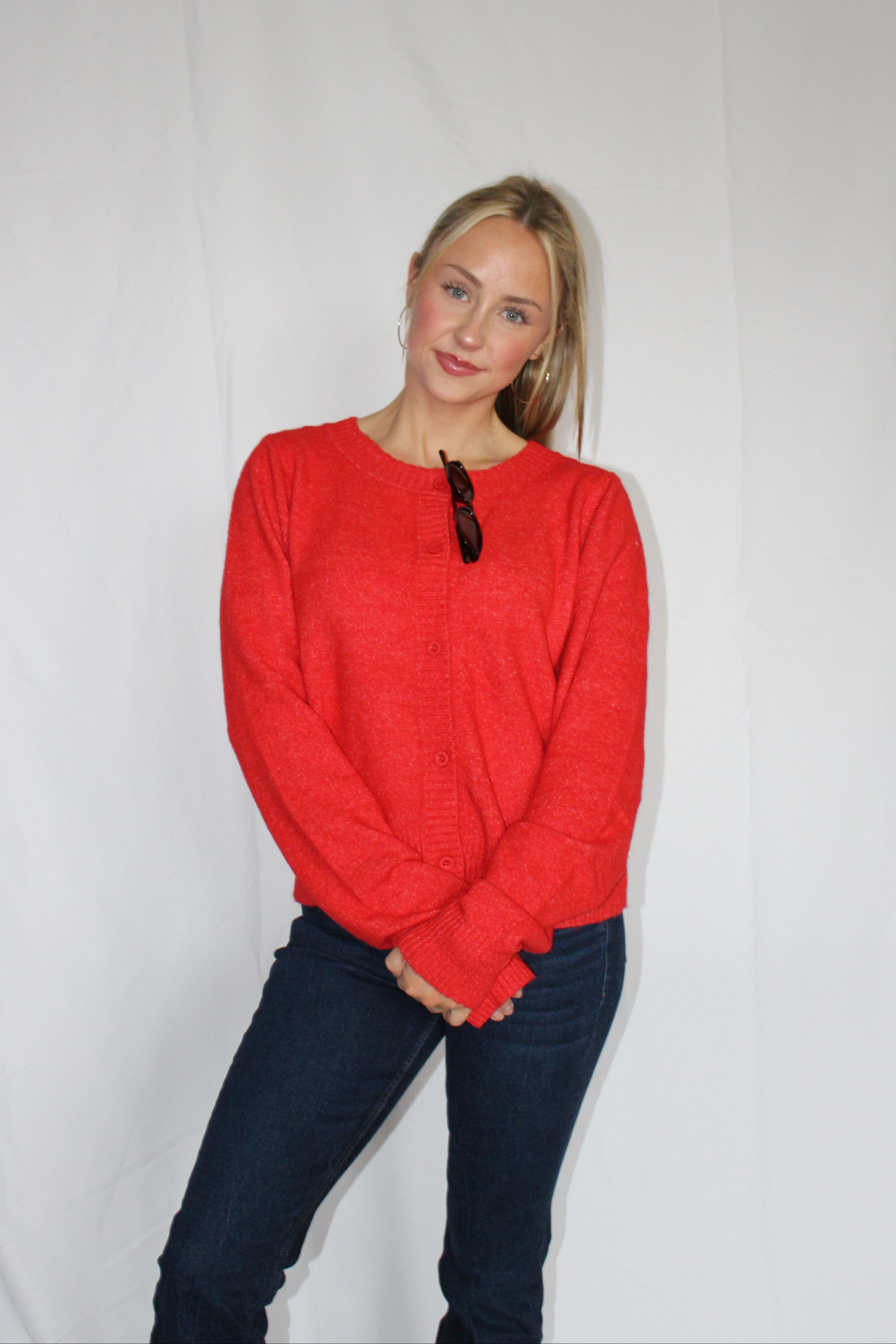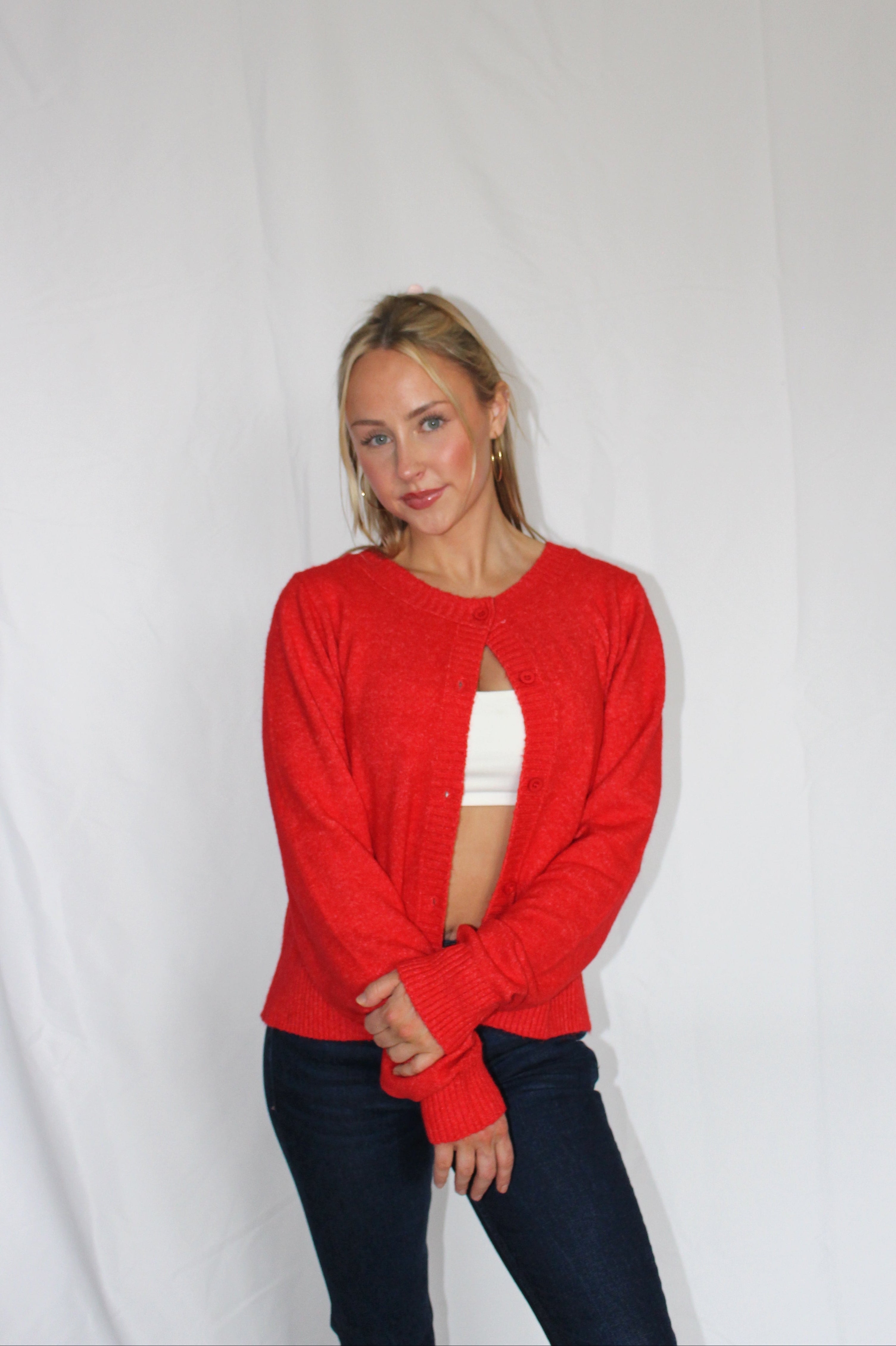 The rich red hue adds the perfect pop of color to your wardrobe, instantly dressing up denim, skirts, or simple basics. Whether worn buttoned up for a polished look or layered open for an effortless vibe, this cardigan is as versatile as it is eye-catching.