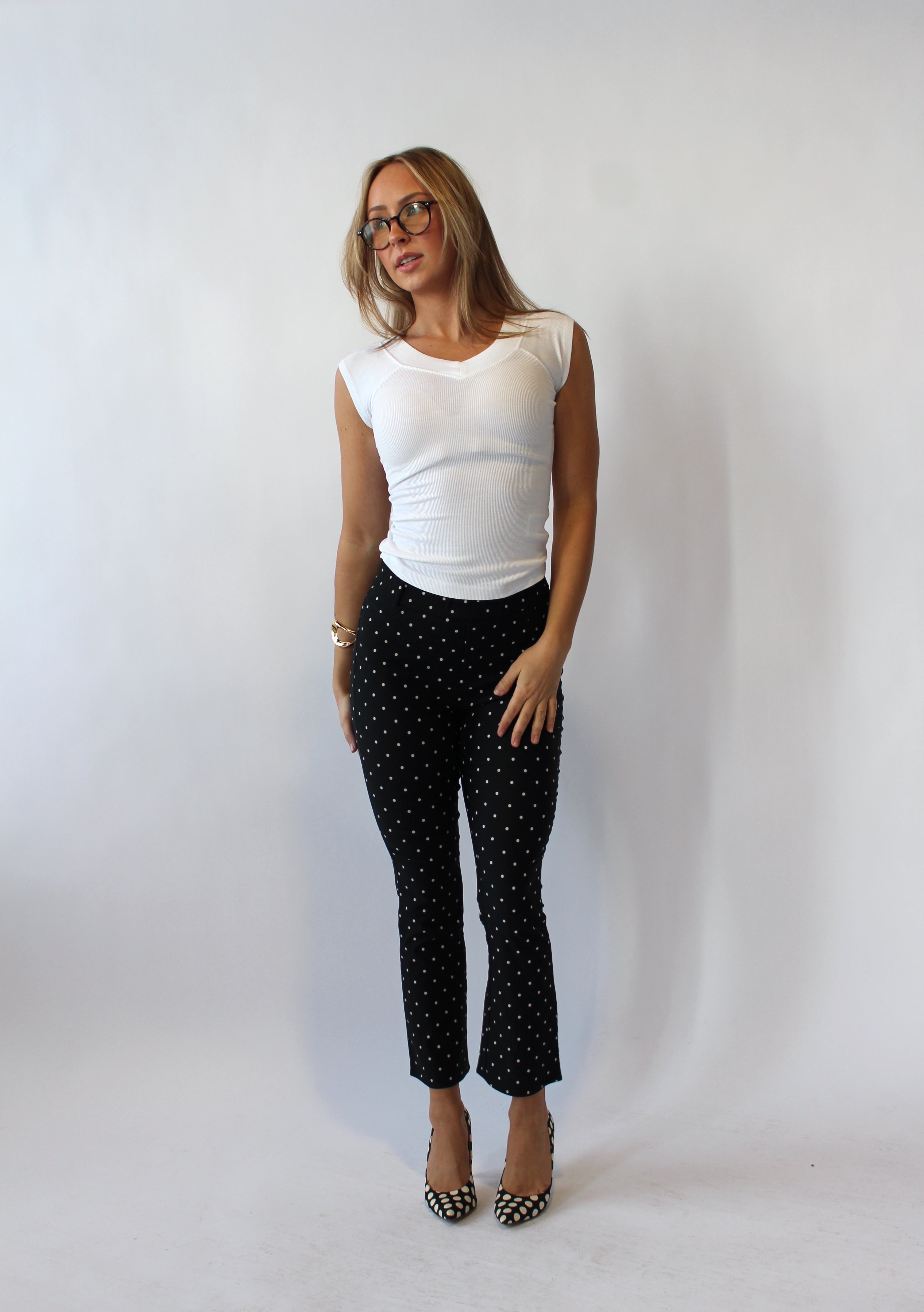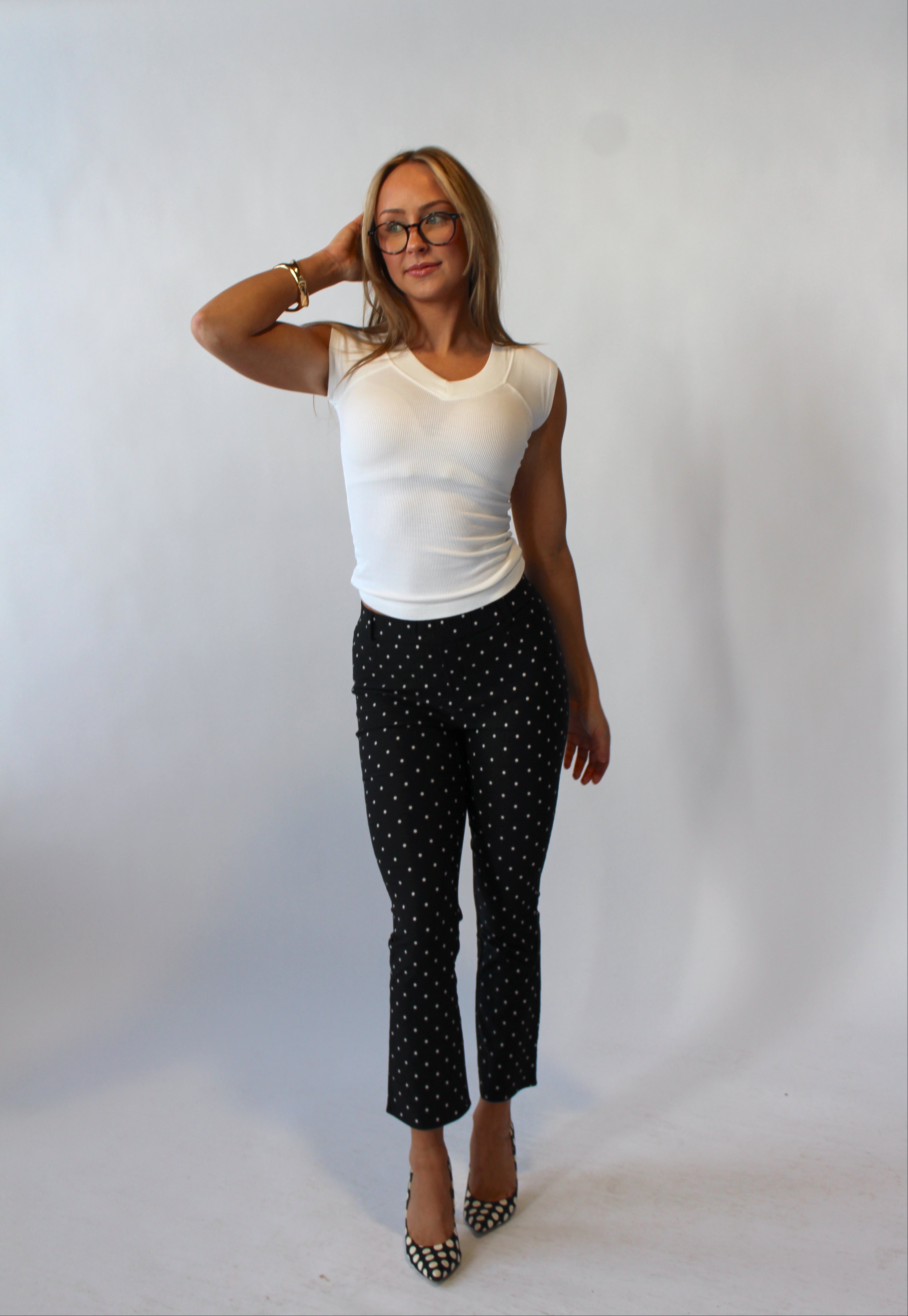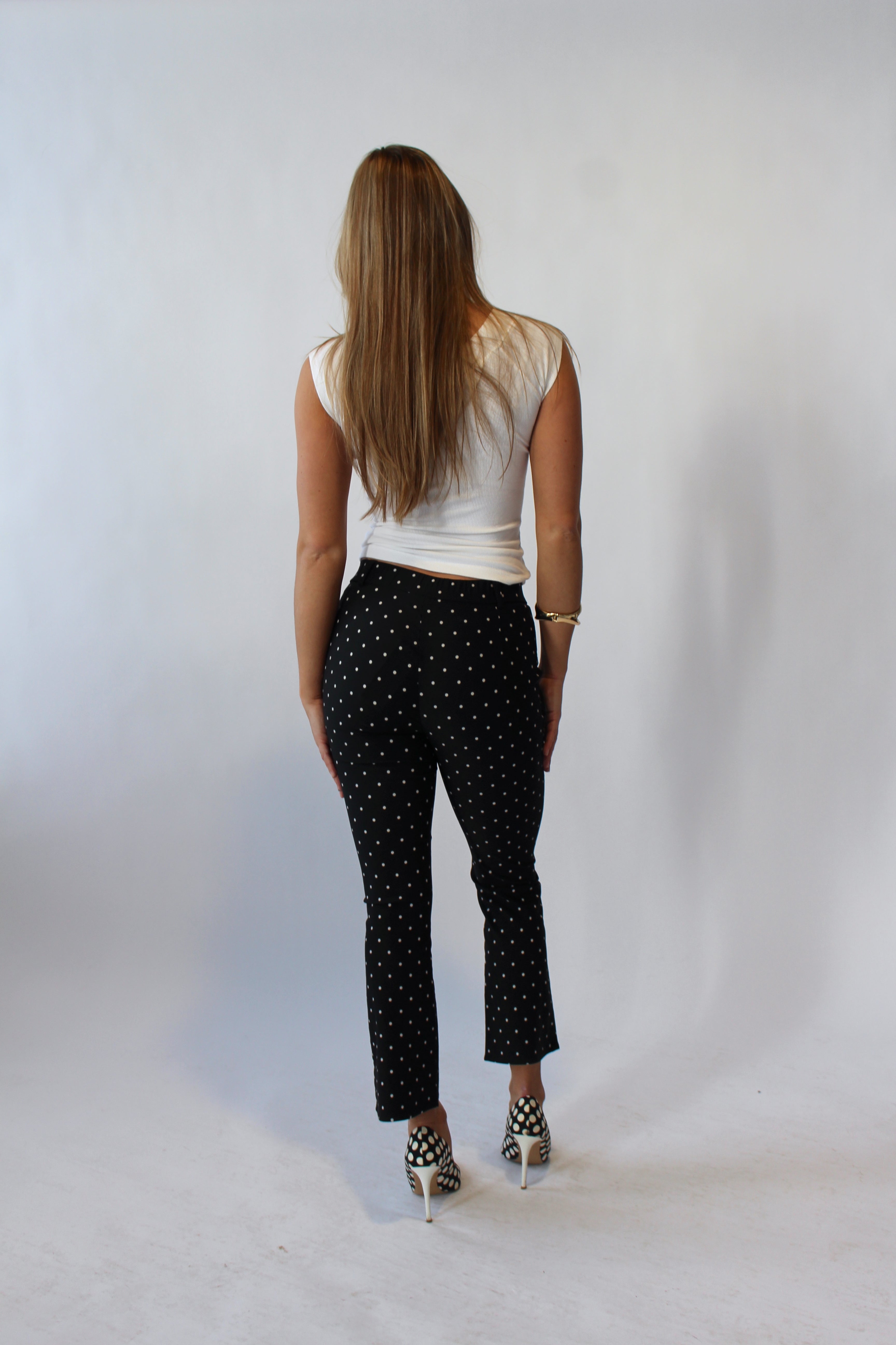 These chic polka dot capris are crafted from a lightweight, stretchy fabric with a smooth, polished finish for a sleek, modern look. Designed to contour comfortably while holding their shape, they offer effortless movement and a flattering fit. A versatile statement piece that transitions seamlessly from day to night styling.